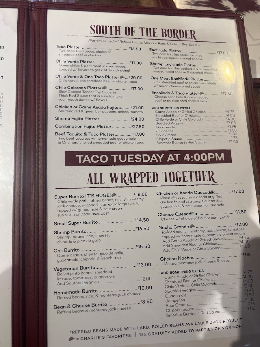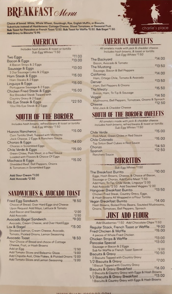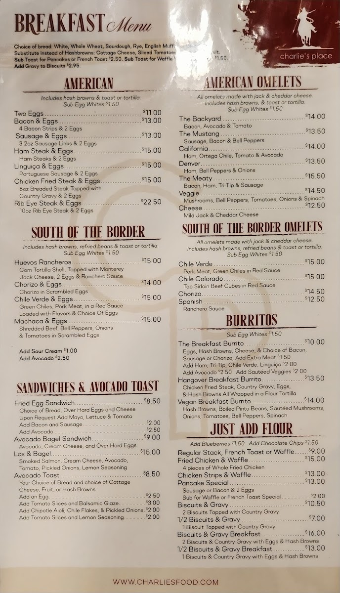 Welcome to Charlie's Place, a beloved restaurant nestled in San Luis Obispo, California. The menu showcases a delightful blend of hearty breakfasts and scrumptious burgers. Start your day with the Mexican Breakfast, featuring a savory Avocado Omelet or the indulgent Breakfast Nachos, topped with refried beans and chorizo. For those who crave something sweet, their Cinnamon Roll is a must-try.